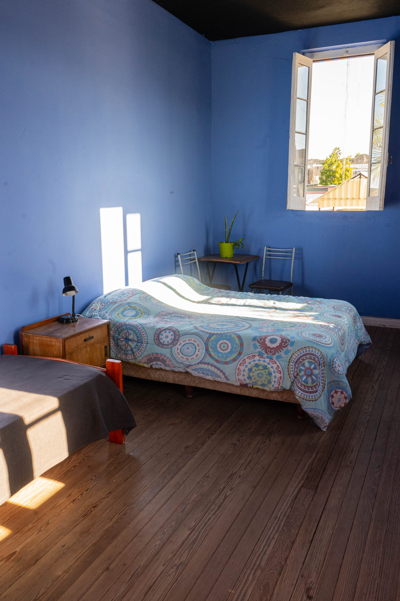 La habitación está ubicada en la planta alta del hostel. Con baño compartido al lado, es la única en ese sector, y con salida exclusiva a la terraza.
